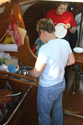 Muonitus pelasi veneessä oivallisesti, tässä ennen lähtöä chili con carne tekeytymässä.