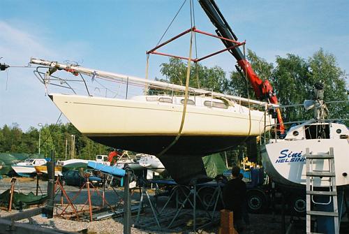 | Kaikki muu paitsi purjeveneen kunnostus on turhaa... Kohti pukkia. Tässä vaiheessa kaikki näytti vielä hyvältä. Osoittautui kuitenkin että pukki oli melko huonosti veneeseen istuva. Paapuorin puoleisen etutassun ja veneen väliin jäi iso rako, samoin tyyrpuurin puoleisen takatassun taakse. Tassujen asentoa / korkeutta ei voi säätää ja siten pukki vaikuttaa hyvin huonosti tähän veneeseen sopivalta. Sain puhelimessa vihdoin ohjeet myyjältä kun soitin tälle kesken nostourakkaa. Tassujen väliin piti laittaa kaksi kakkosnelosta molemmille puolille ja johan sopisi. Tämä vaikutti minusta ja kaikista paikalla olleilta hyvin oudolle, mutta vaihtoehtoja ei ollut. Nyt vene on tuettu pukeille virityksillä ja pukki mennee vaihtoon seuraavaksi talvikaudeksi. Jos olet kiinnostunut ostamaan muuten hyvän ja erittäin tukevan pukin (ei vain sovi Ohlonille) niin nyt olisi myynnissä. Ota yhteyttä ja neuvotellaan sopiva hinta.