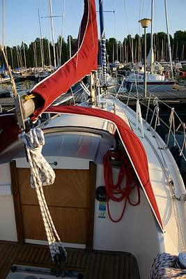 Kunnostuskohteita, osa 3 Uusi puomipeite ja sprayhood saapuivat viimein VA-kuomulta muutaman kerran niitä kinuttuani. Varsin kohtuullinen näky. Tosin sprayhood on tehty hieman väärin ja siitä reklamoin, sovimme, että lähetän syksyllä sen takaisin viimeisteltäväksi hieman paremmin. Esimerkiksi isopurjeen nostimelle ei oltu tehty läpikulkureikää vaikka nimenomaan sitä pyysin tekemään ja kohdankin olin merkinnyt vanhaan sprayhoodiin.