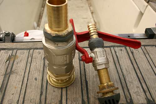 Kunnostuskohteita, osa 4 Pari uutta läpivientihanaa. Kuulaventtileihin on tässä jo kierretty letkuliittimet. Tiivisteenä hamppua ja putkikittiä. Asiantuntijoiden mukaan hampun ja kitin käyttö on turvallisempaa kuin tiivisteteipin. Teippikin toimii ihan hyvin, mutta jos liitosta kääntää vahingossa vähänkin auki, tulee tiiviste uusia kokonaan. Hamppu/kitti-yhdistelmällä voi liitosta hieman avata ja taas uudelleen sulkea ilman, että tiivistevaikutus poistuu. Toinen neuvo oli käyttää niin paljon hamppua kuin vain ympärille saa kierrettyä niin, että kappaleet vielä saa tarttumaan toisiinsa..