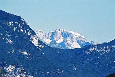 Lago di Garda Desenzanosta kävelin Torbolen yläpuolella Gardan itäpuolella olevalle vuorelle - Monte Baldon vuorijonon ehkä korkeimmalle huipulle. Vuonna 2002 Dolomiiteilla oli lunta elokuussakin aika paljon. Tässä on luoteeseen Gardalta olevia huippuja.