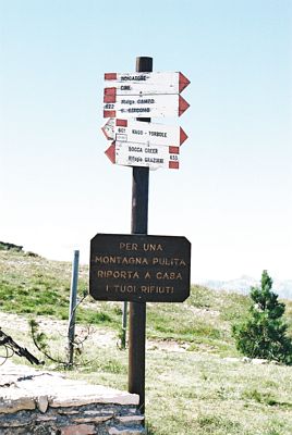 Lago di Garda Vuoren huipulla oli tietenkin suuntaviitta Torboleen takaisin ja edelleen kohti muita vuorenhuippuja. Patikointireitit on kuvattu aika hyvin ja merkitty punavalkoisilla merkeillä maastoonkin. Kylteissä on aina seuraava etappi ja arvoitu matka-aika tunneissa / minuuteissa sinne. Käytänössä ajat ovat aika maltillisen tarpomisen mukaan tehtyjä eli leppoisaa kävelyvautia pitävät paikkansa ilman suurempaa hikeäkin hyväkuntoiselle.