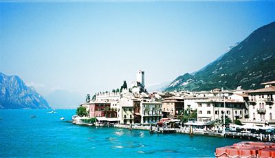 Lago di Garda Järven vesi peilautuu kauniin värisenä lautan jatkaessa matkaa.. Sää saattaa alueella vaihtua hyvinkin nopeaan. Järvestä nouseva kuuma, kostea ilma saa aikaan nousevan ilmavirtauksen joka estää päivällä lähestyvän saderintaman aika tehokkaasti, mutta jos aurinko menee pilveen saattavat lähistöllä liikkuvat matalapaineet vyöryä nopeastikin kattilamaiseen laaksoon ja viipyä yllättävänkin tiukasti paikallaan.. Tällä reissulla sade yllätti pohjoiseen matkatessa kun eteläpäässä oli täysi helle auringon paahtaessa.