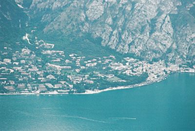 Lago di Garda Limonen kylä kuvattuna Torbolen yläpuolelle nousevalta vuorelta. Limone on yksi vanhoista kylistä jonne kulki ennen vain aasipolku yli vuorten - sitruunaviljelijöiden aluetta. Aasipolkua pitkin pääsee vieläkin kulkemaan ylös vuorille ja matkalla näkee vanhoja sitruunoiden varastoimiseen tarkoitettuja kivisiä "siiloja".