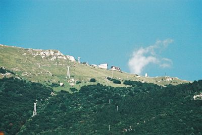 Tredes Pin. Monte Baldon huippu Malcesinen kohdalla. Kuvassa näkyy hyvin gondolihissin mastorivi ja ylhäällä oleva hissirakennus sekä ravintolarakennus (oikealla).