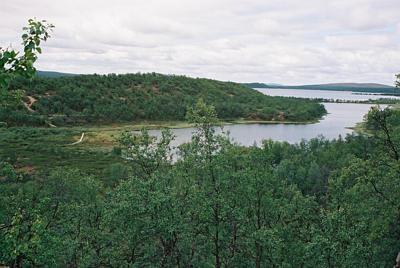 Vuonna 2002 tuli lomailtua ja matkailtua kohtuullisen paljon - ennenkaikkea luonnossa. Ruktajärven koillisen / idänpuoleinen pää majan yläpuolelta kuvattuna. Vastapäisellä rannalla näkyy ensin pitkospuut ja siten polku jota pitkin rantaa pitkin reitti Karigasniemen tieltä (12 km) tulee loppumatkan. Vastapäisellä harjulla näkyvät polut johtavat ylös harjulle ja siitä vasemmalle kohti Ristinäsjärven leiripaikkaa (3 km päähän). Moni poluista on porojen tekemiä.