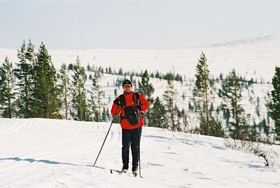 Kiilopään kupeessa kameralaukku vatsanpäällä ja reppu selässä.