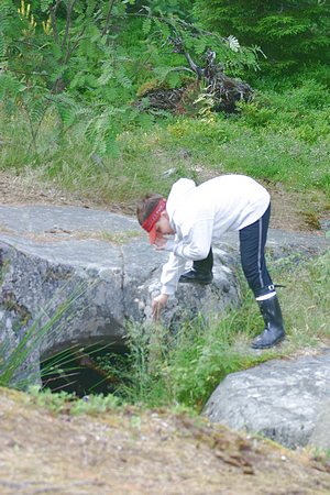 Hiidenkirnuja on Rosalassa toistakymmentä, syvimmät yli miehen mittaisia.. Joonas kokeili pitkällä oksalla kaikkia. Pohjaa ei niistä näkynyt, vesi oli täyttänyt kaikki.