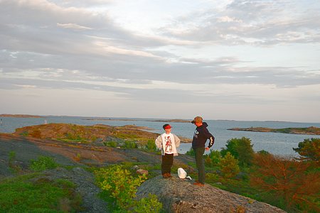 Iltatarinaa miehistön kesken Trunsön kallioista korkeimmalla.