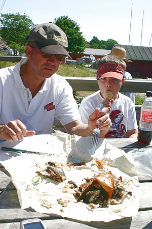 Kesän 2005 purjehduskuvia Aspö. Ja aamupalaa viimein.. tuoreita vastaleivottuja sämpylöitä ja ennenkaikkea tuoreita savustettuja kampeloita.. yhteen sämpylään meni kaksi kampelaa perattuna.. Nuorempi miehistön jäsen on jo siirtynyt omaan jäliruokaansa.