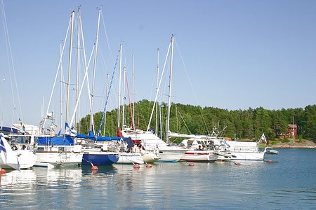 Kesän 2005 purjehduskuvia Nauvon satama - ja taas erottuu punainen puomipeite hyvin. Nauvossa miehistöksi tuli serkkuni Mika. Kävimme illallisella maissa ja palattuamme veneelle, laiturille pöllähti tuttu pariskunta yllättäen - olivat pyöräretkellä Saariston rengastietä pitkin. Pieni maailma.
