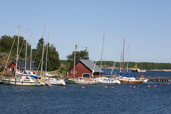 Kesän 2006 purjehduskuvia Vierasvenesatama näyttää liki tyhjälle ja silti se tuntui olevan hyvinkin täynnä. Tässä kuvassa näkyy olevan pari poijua tyhjänä - ja kello on vasta n. yksi päivällä. Paikat olivat se verran liki toisiaan tai veneet hassusti kiinnitettyjä, että väliin ei kunnolla mahtunut - pari venettä kävi myöhemmin illalla poijujen täytyttyä katsomassa ja kääntymässä pois toiseen satamaan.