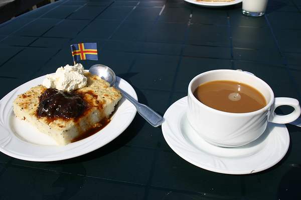 Syy Joonaksen ja minun pyöräilyyni: ahvenanmaan pannukakkua Helsön sataman yläpuolella olevassa ravintolassa...