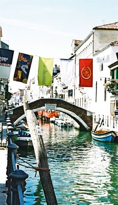 Kanaalien yllä roikkuu Venezian Biennalen mainoslakanoita.. ja tietenkin biennale oli suljettu maanantaisin kun siellä juuri sitä varten tällä reissulla v. 2001 olin...