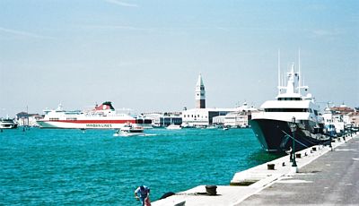 La Serenissima, Venezia.. Venezian laguuna on vilkas satama-allas. Etualalla amerikkalaisen lipun alla purjehtiva loistoristeilijä ja takana matkustaja-alus - yksi monista. Veneziasta on vilkas yhteys Adrianmeren yli eri satamiin, vähän kuin Suomenahdella eri maiden välillä.