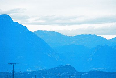Sininen hetki Desenzanosta kohti Saloa ja vuoria. Idylli olisi täydellinen ilman kuvaan päässeitä antenneja..