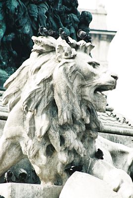 Duomon edustalla olevalla aukiolla on patsas jonka juuressa leijonat tarjoavat lempeästi istuimen kyyhkysillekin.