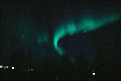 vuonna 2003 kävin yhden kerran viikon aikana Tunturihotellin ravintolassa. Takaisin majalle kävellessäni puolenyön jälkeen taivas hehkui revontulia - eikun mökiltä kamera mukaan ja toppahaalari päälle ja Kaunispään rinteelle kuvia koittamaan. Tämä oli ainoa yli kymmenestä kuvasta joka edes vähän onnistui.