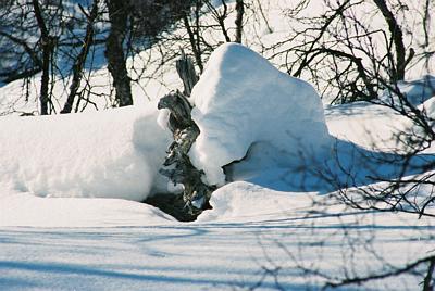 Kaatunut kelo lumen peittämänä. Pesäpuu monille, nyt hautautuneena.