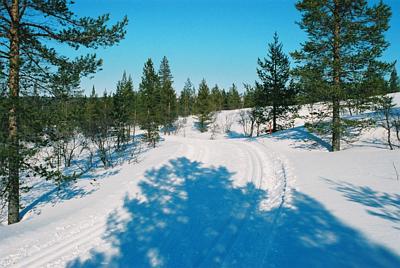 Latu-uraa kohti Vellinsärpimää Luulammelta tultaessa. Tästä suunnasta matka kulkee suureksi osaksi alamäkeen niin, että ei tarvitse kuin hieman lykkiä ja vauhti pysyy varsin kohtuullisena ilman suurempia ponnistuksia.