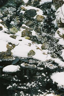 Kohti Kulmakurua vuonna 2003. Vähäisen lumen alta paljastuva puron reuna ja rinne sen yllä olivat huurtuneet yön pakkasissa.
