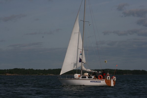 Kesän 2007 purjehduskuvia Kasnäsissä oli suhteellisen hyvin tilaa, lähdin seuraavana aamuna kohti Hankoa - sääennuste lupaili melko navakkaa vastatuulta ja näinhän siinä kävi. Tässä ensimmäinen vastaantulija, puolalainen Andromeda Hiittisten jälkeen Matlösharunin paikkeilla. Tässä saaret vielä suojasivat aalloilta aika hyvin...
