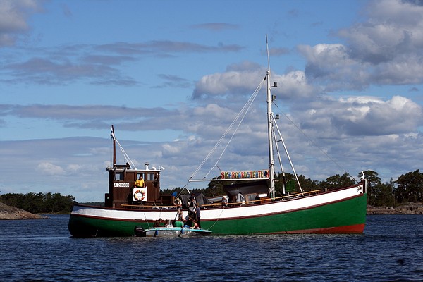 Kökarin Hellsössä näkemäni saaristolaisteatterilaiva tuli täyttä höyryä ohi, jarrutti ja siirsi miehistöä paikalle tulleeseen pienveneeseen Ådön kohdalla.
