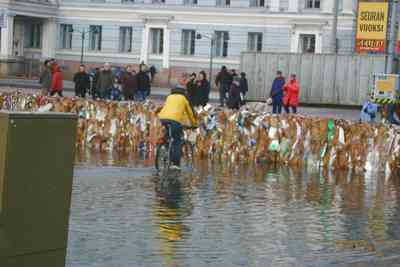 Solmuja | Vedenpaisumus Pitkin kauppatorin laiturin reunaa ilmestyi yhtäkkiä ajelemaan pyörällämies, joka sai katsojat haukkomaan henkeä: ajaako ohi laiturista vai ei? Itse ihmettelin enemmän, mitä suolavesi vaikuttaa pyörän rattaisiin ja ketjuihin....